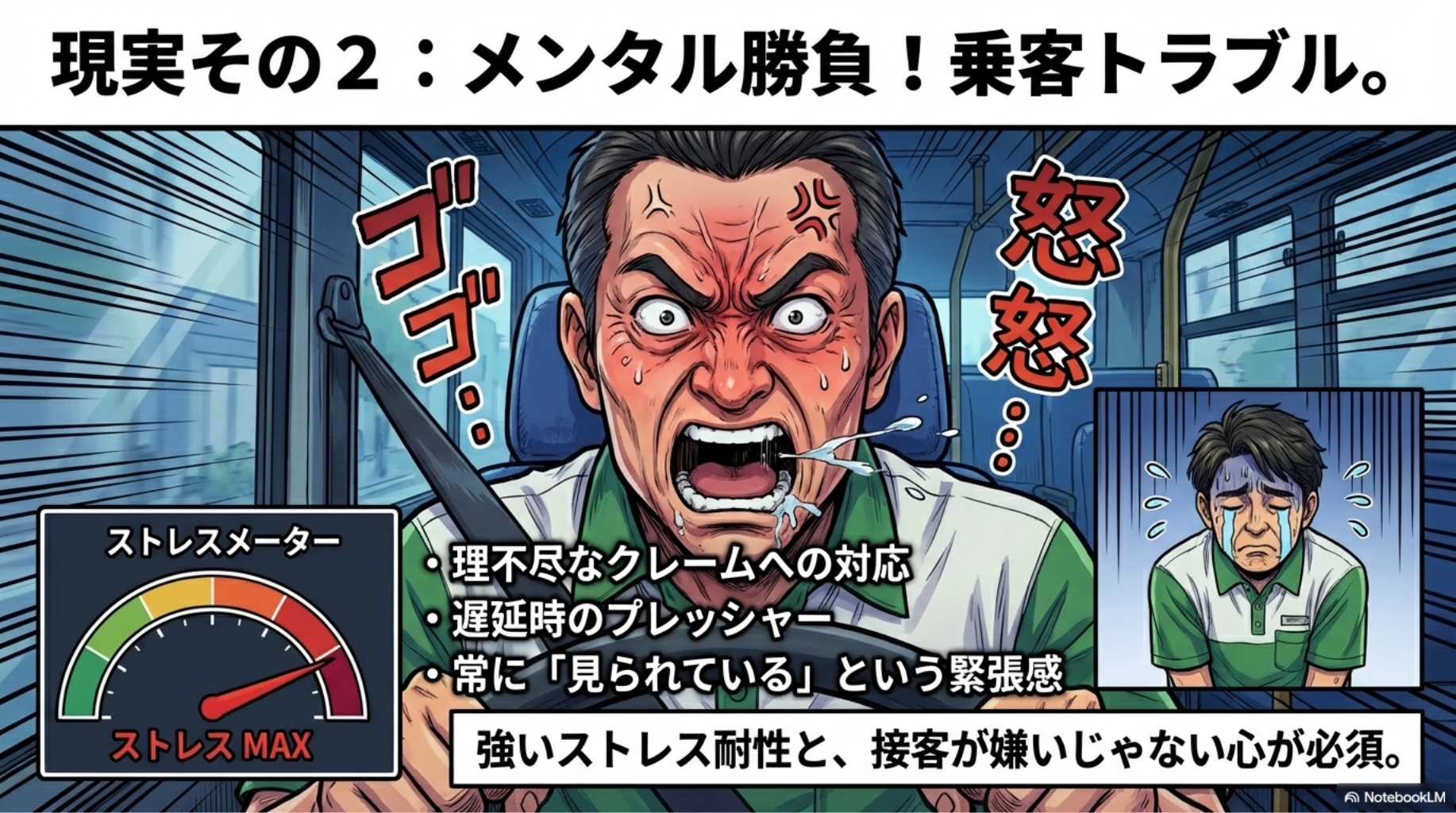 定時運行へのプレッシャー、地元住民からのクレーム、公務員としての責任感。